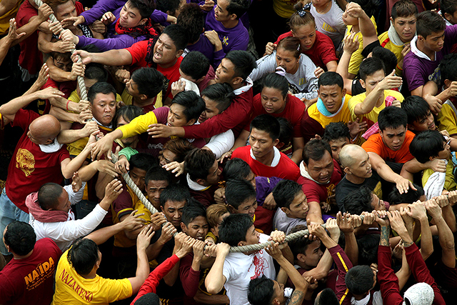 Catholic devotees hold on to the rope that pulls the carriage carrying the image of the Black Nazarene during the Traslacion in Manila on Friday, January 9. The image was brought to the Philippines by a Spanish priest from Mexico in 1606. Friday's event had resulted in the death of one devotee, with hundreds rushed to hospitals and emergency tents due to their injuries. Danny Pata