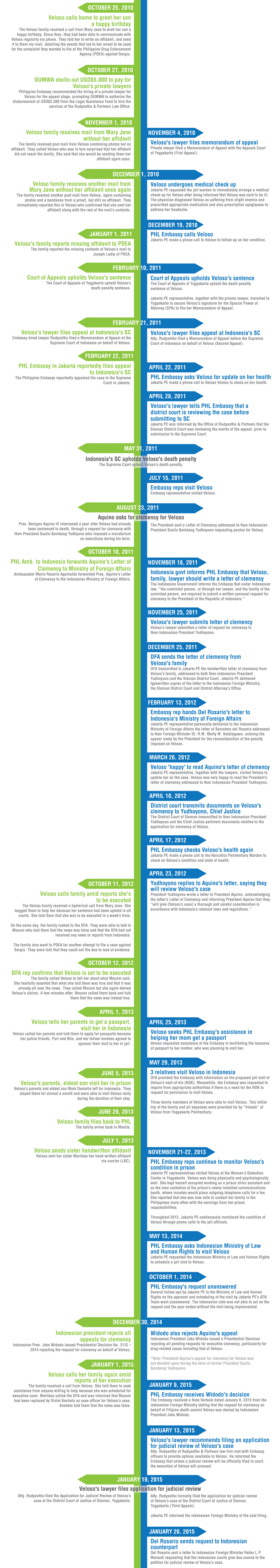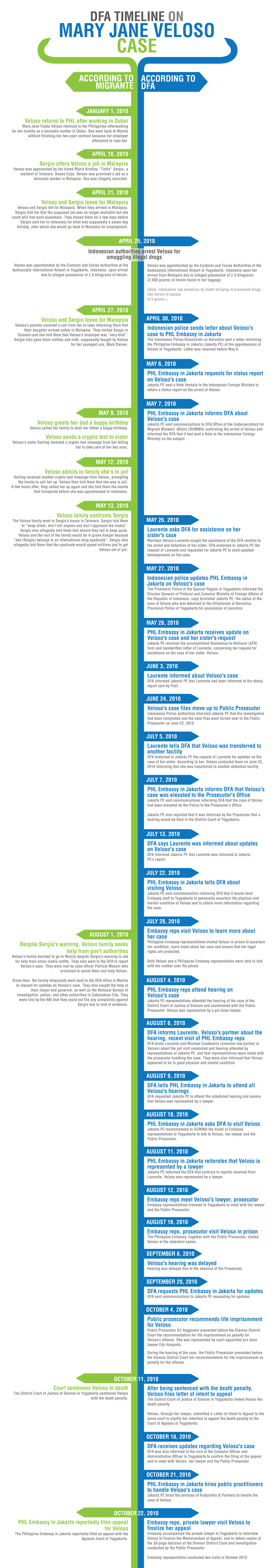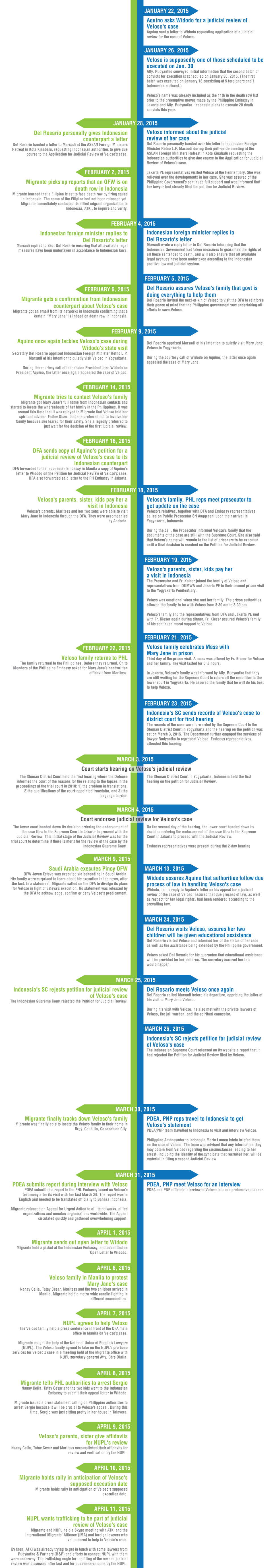 Migrante International based its timeline on the sworn affidavits of Veloso's family, a timeline given by the DFA to the Velosos, the personal knowledge of Migrante and the National Union of People’s Lawyers of actions taken for the #SaveMaryJane campaign, and media statements by the DFA and the Palace.