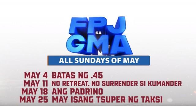 "FPJ sa GMA" continues as GMA Pinoy Blockbuster unveils more of Fernando Poe Jr.'s iconic and memorable movies: "Batas ng .45," "No Retreat, No Surrender si Kumander," "Ang Padrino," and "May Isang Tsuper ng Taksi."