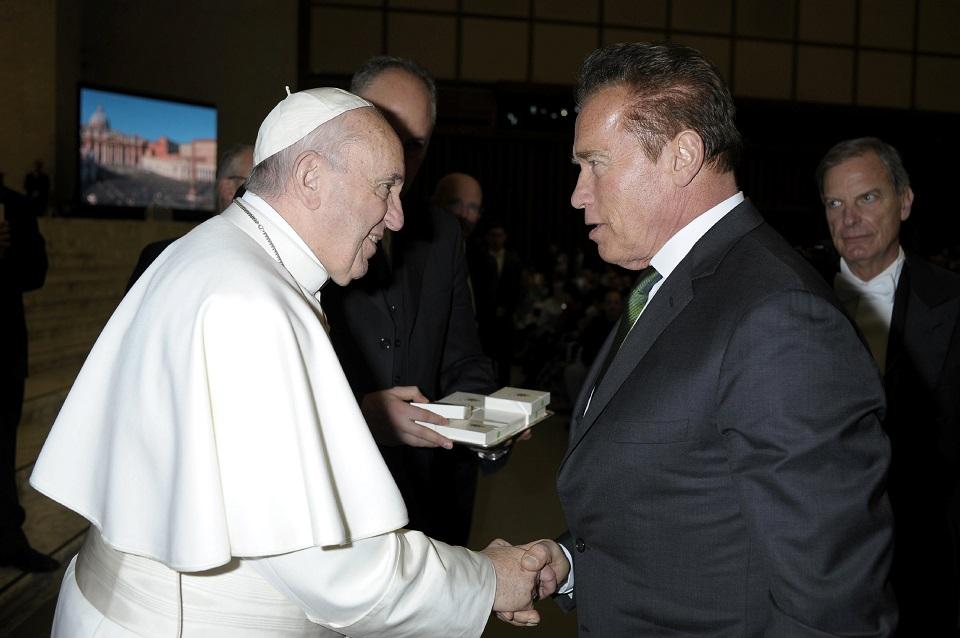 Pope Francis meets actor Arnold Schwarzenegger during Wednesday general audience in Paul VI Hall at the Vatican January 25, 2017. Osservatore Romano/Handout via REUTERS