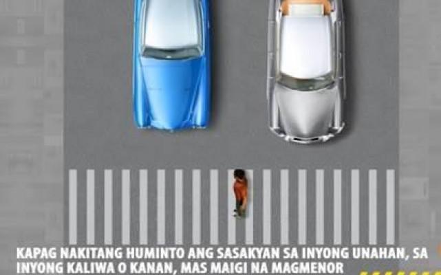 Paalala sa mga motorista, ang sasakyan na nagmenor o nakahinto sa inyong unahan ay nagsisilbing visual screen o tabing. Ibig sabihin, babala ito na posibleng may papatawid na pedestrian kaya dapat huminto at magbigay-daan para iwas-disgrasya. Alamin ang iba pang pedestrian safety tips.
