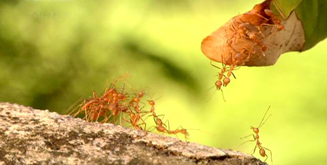 Meanwhile, some tiny caterpillars are up early for the day’s giant task. They must coordinate their bodies and work in sync, to be able to fold one big leaf that will serve as their hideout for the rest of the day. But if one is not too careful, one of them can fall prey to fire ants. In fact, just below them, hundreds of tiny but notorious fire ants carry their hunt for the day, a giant helpless caterpillar.