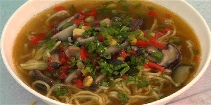Place the cooked noodles in a bowl and pour in the vegetable stock. Serve.