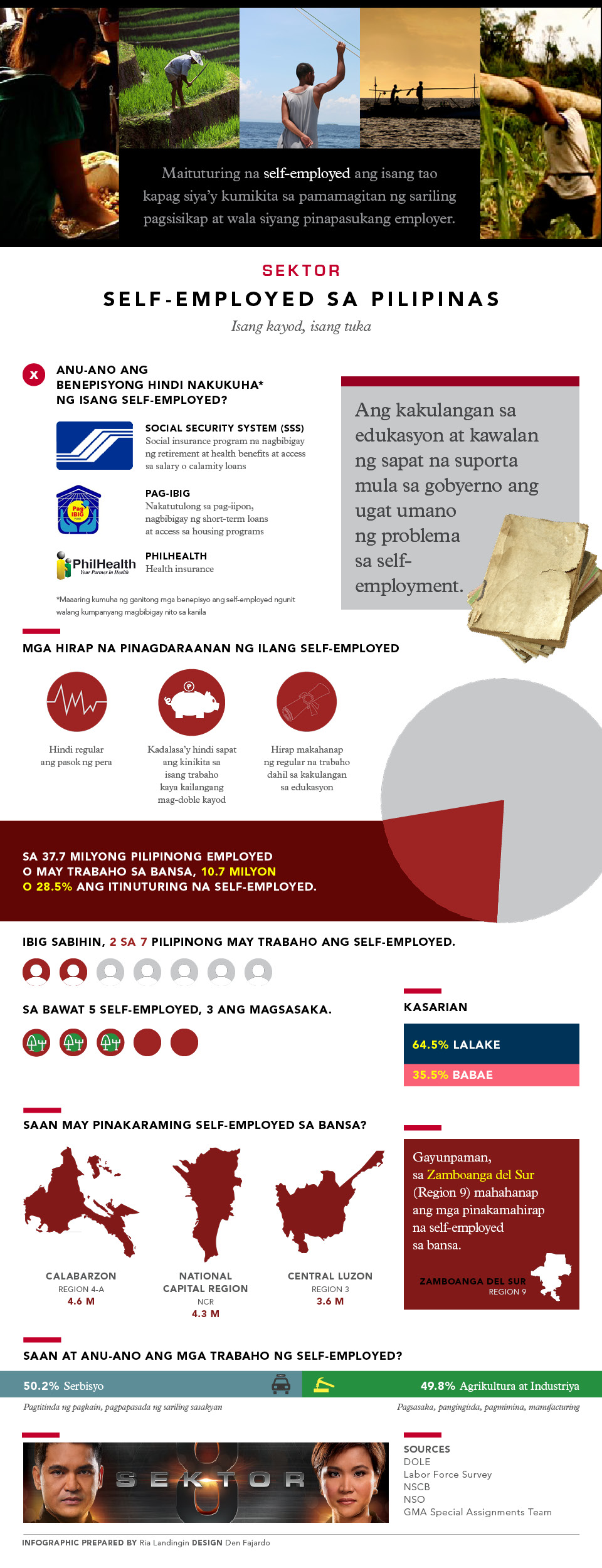 Sa ika-apat na yugto ng SEKTOR, ang ika-8 anniversary special ng programang "Reporter's Notebook," siniyasat ang mga dahilan kung bakit patuloy na nalulugmok sa kahirapan ang ilang self-employed sa Pilipinas. — Ria Landingin/Infographic by Den Fajardo/CM/PF, GMA News
