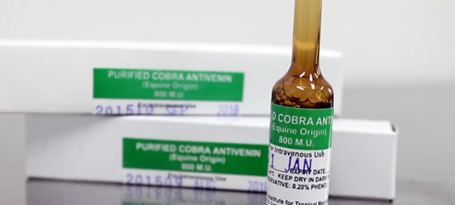 Antivenom ang pangontra sa kamandag ng cobra. Pero para magawa ito, kailangan munang kunin ang kamandag mula mismo sa ahas. Sa isang farm ng Research Institute for Tropical Medicine o RITM sa Los Banos, Laguna, nag-e-extract ng venom mula sa Philippine cobra. Pero limitado lang ang nagagawa nilang antivenom. Sa San Lazaro Hospital halimbawa na pangunahing takbuhan ng mga nakakagat ng ahas, pinagkakasya lang nila ang 25 vials ng antivenom kada buwan.