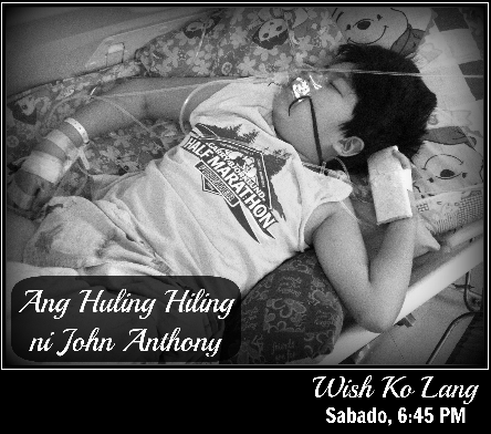 Nag-umpisa lang daw sa pagkirot sa tagiliran, hanggang sa sumuka na rin ng dugo. Ito ang mga dahilan kaya sinugod ang sampung taong gulang na si John Anthony sa isang ospital sa Quezon City. Napag-alaman na siya ay may aplastic anemia. Malayong-malayo raw sa mga katangiang noon na masayahin, masigla at aktibo, dahil ngayon, hindi na raw nakakapag-salita at paralisado na ang ilang bahagi ng katawan. Isang buwan na rin siya nasa ospital at hindi bumubuti ang kanyang kalagayan. Ngunit bago raw umurong kanyang dila, humiling siya na sana ay makita ang kanyang lola, kapatid at ilang kaklase na nasa Pangasinan. Sundan ang Wish Ko Lang sa Twitter at Facebook!