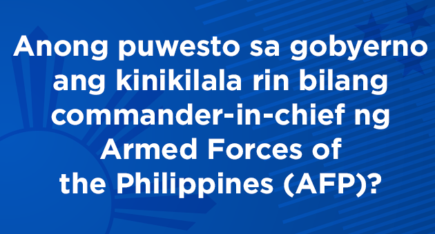 11. Anong puwesto sa gobyerno ang kinikilala rin bilang commander-in-chief ng Armed Forces of the Philippines (AFP)?