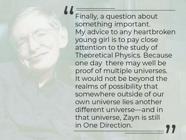 4. At the Sydney Opera House in 2015, in response to the question "What do you think is the cosmological effect of Zayn leaving One Direction and consequently breaking the hearts of millions of teenage girls across the world?":