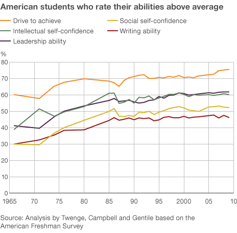 BBC reported that Twenge and her team also found that while "students are increasingly likely to label themselves as gifted in writing ability, objective test scores indicate that actual writing ability has gone down since the 1960s."