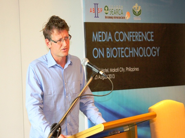 He was recently in the Philippines on a research trip funded by Cornell University, having come from the Borlaug Global Rust Initiative 2013 Technical Workshop in New Delhi. A media conference, titled "Meeting the Challenges of Food Security with Biotechnology," was organized by SEARCA, ISAAA, and ABSP, at the Dusit Hotel in Makati on August 23.