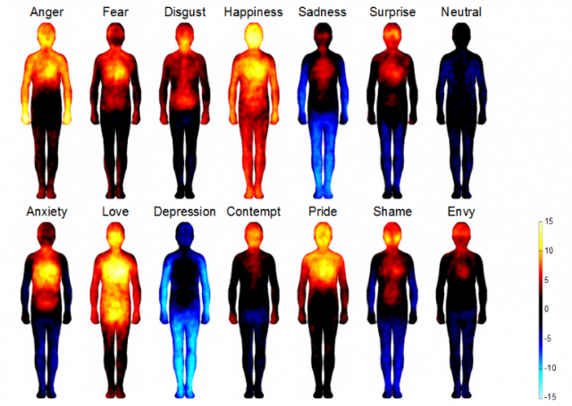 A team of biomedical engineers in Finland asked subjects from Finland, Sweden, and Taiwan to map out where they felt emotions on their bodies, using different colors. The study, which was published in the Proceedings of the National Academy of Sciences (PNAS), involved the use of computer-generated silhouettes of the human body as a map of emotions.