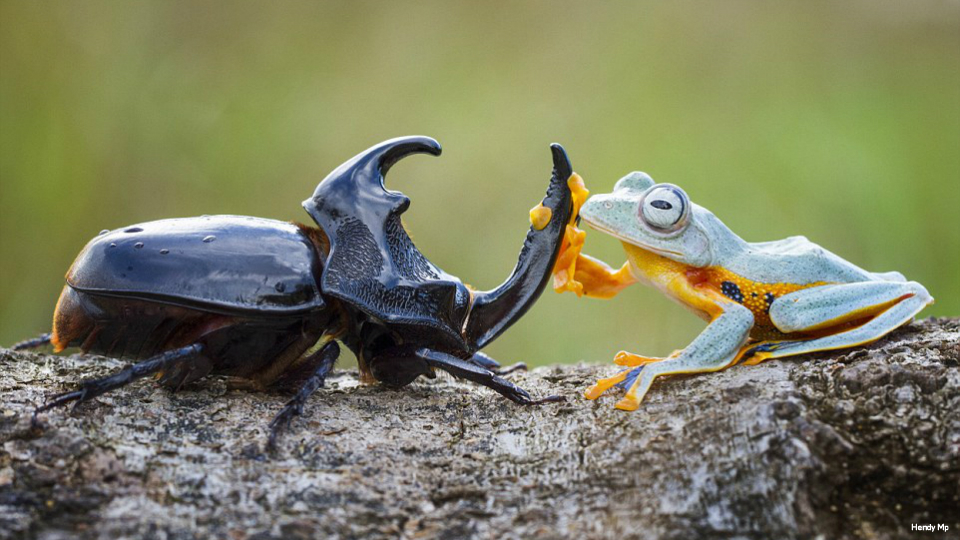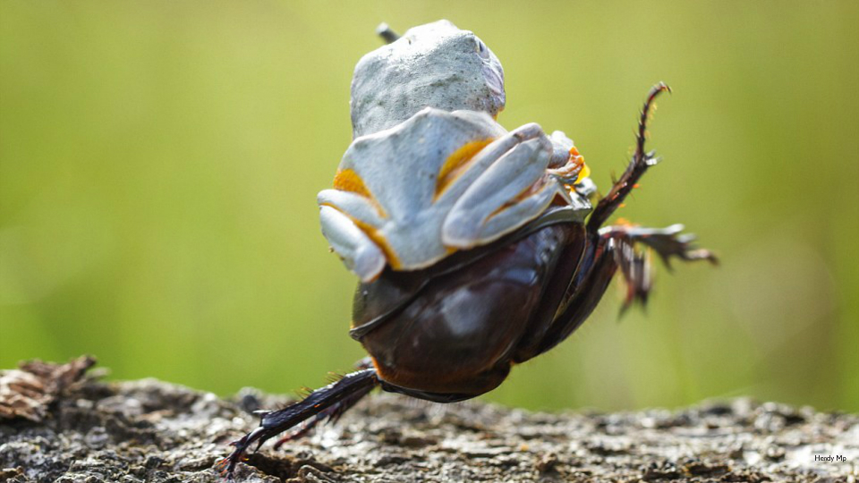 No, this is no camera trick: this frog is indeed riding this rhinoceros beetle, cowboy-style.