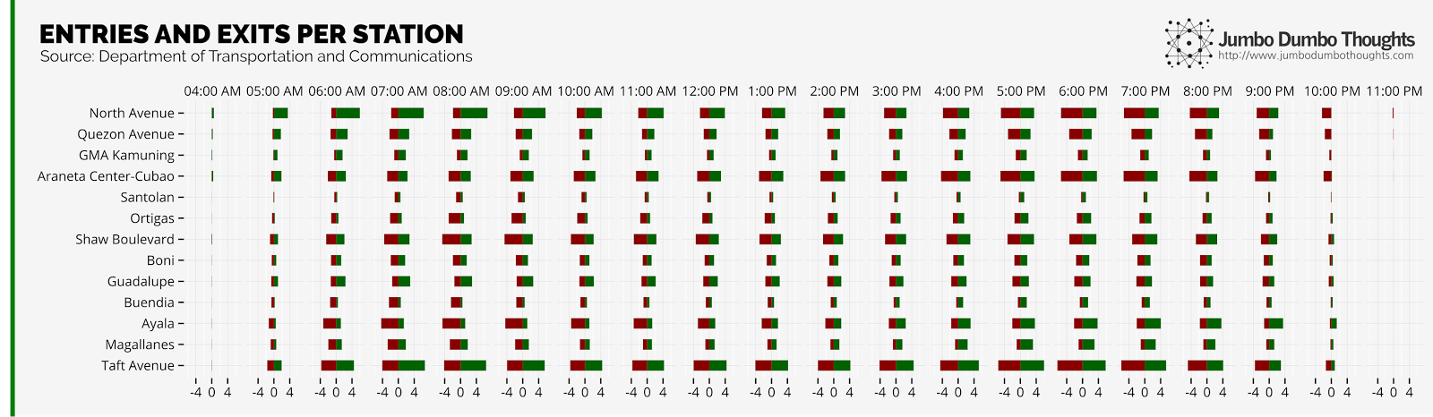 Such a phenomenon is more clearly illustrated in the chart on the left (click to enlarge). Stations near residences and north/south entry points (North Avenue to Araneta Center, Guadalupe, Taft Avenue) have more people coming in that leaving during the day when people are heading to work. Other stations, near workplaces (Santolan, Ortigas, Shaw, Buendia, Ayala, Magallanes), have more people disembarking during the morning rush hour. At around 1pm, the pattern for all of the stations flip, when people begin to return to their homes.