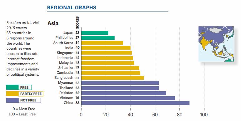 There’s also no change in the Philippines’ freedom of Internet score between 2014 and 2015. Press freedom is considered partly free and improving access to Internet is hindered by expensive subscription fees and service limited mostly to major cities.