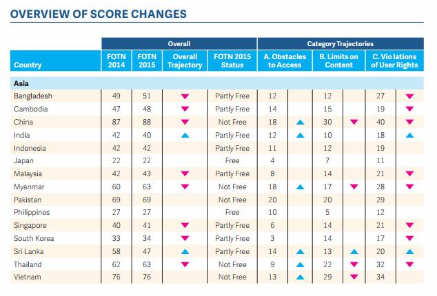 The report, entitled Freedom on the Net 2015, looked at the Internet freedom of 65 countries around the world, scoring countries based on three criteria—obstacles to access (25 points maximum), limits on content (35 points maximum), and violations of user rights (40 points maximum). A total score of 0 is considered the most free and 100 is the least free.