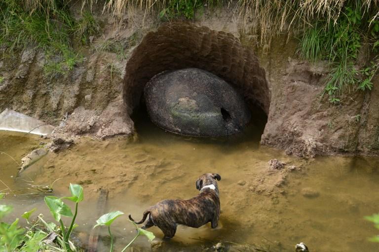 A dog looks cautiously at the glyptodont shell found in Carlos Spegazzini, Buenos Aires Province, Argentina, on December 29, 2015. AFP PHOTO/EITAN ABRAMOVICH