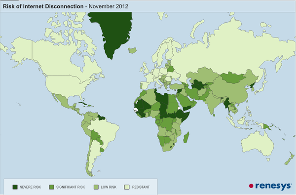 Renesys said 61 countries are at severe risk of Internet disconnection. These include those with only one or two companies at the international frontier.