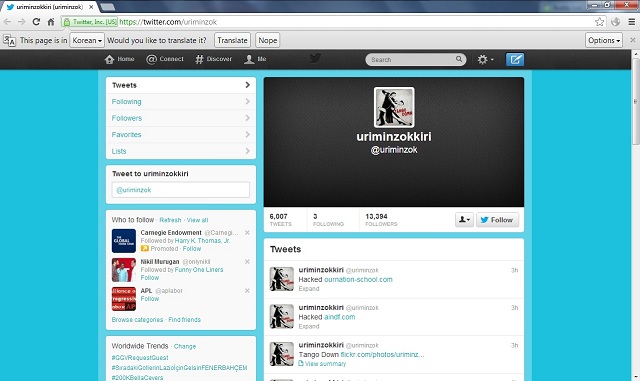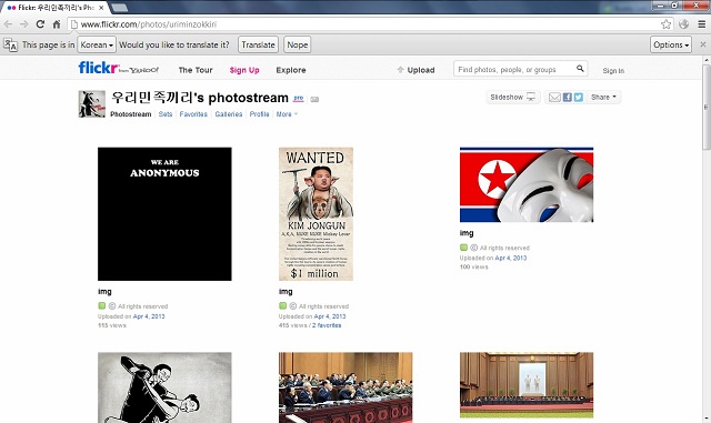 Meanwhile, several posts on North Korea's Twitter account (Twitter.com/uriminzok) bore the message "Hacked." Even the Twitter account's profile photo was changed to show two people dancing the tango, with the message "Tango Down." Not even North Korea's Flickr account was spared, featuring photos with the Guy Fawkes mask; a black background with the message "We are Anonymous"; and a parody of North Korean leader Kim Jong Un.