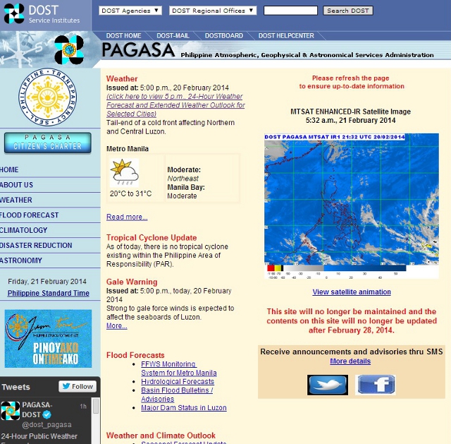"This site will no longer be maintained and the contents on this site will no longer be updated after February 28, 2014," PAGASA said.