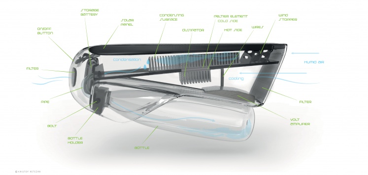 "My goal was to create a small, compact and self-sufficient device able to absorb humid air, separate water molecules from air molecules and store water in liquid form in a bottle," its creator, Kristof Retezar, said on the James Dyson Foundation website.