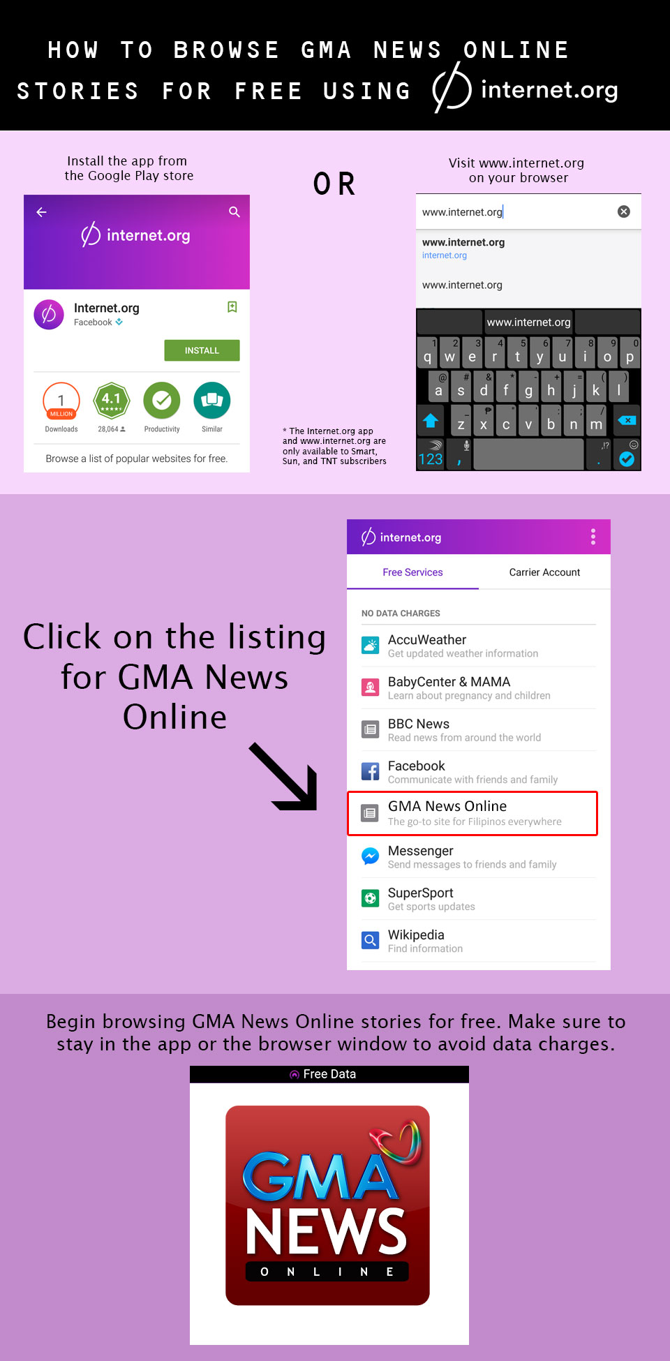 Smart and Talk 'N Text subscribers can begin browsing GMA News Online for free on June 9 through the Internet.org app or through their browsers. Anyone with a mobile phone or SIM-enabled tablet can access the stories from the site without incurring any additional data charges.