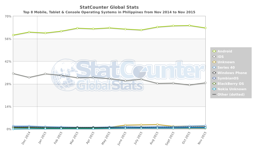 According to independent metrics from StatCounter, Android is the dominant mobile OS in the Philippines, with a 63% local market share as of November versus iOS' 29%.
