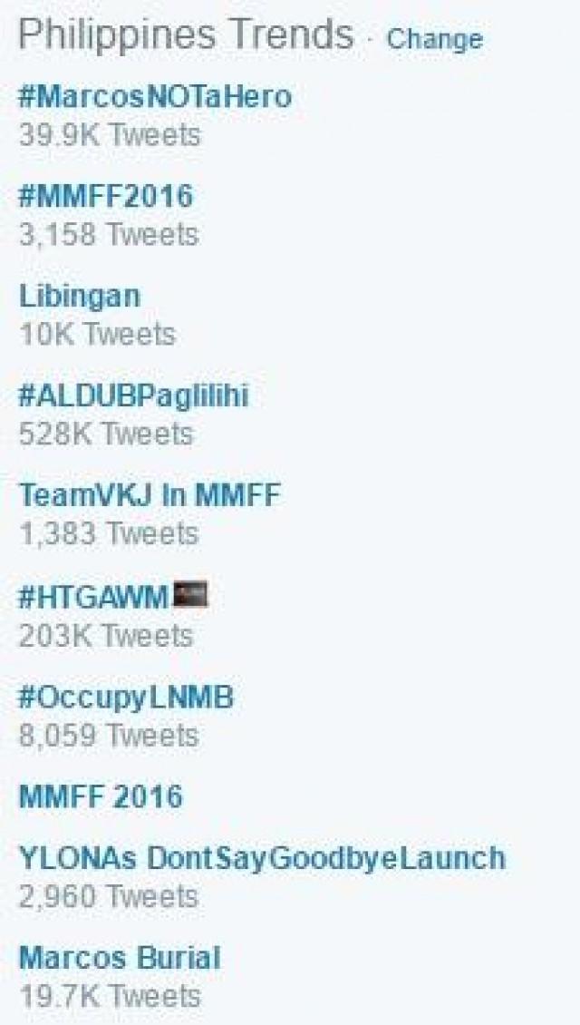Also trending locally were the hashtag #OccupyLNMB as well as the keywords "Libingan" and "Marcos Burial." — GMA News