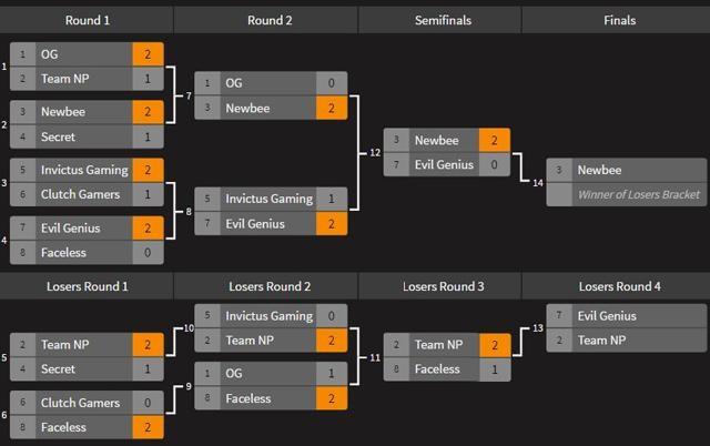 Day 2 focused on Losers Brackets Rounds 2 and 3, which involved Invictus Gaming, Team NP, OG, and Team Faceless.