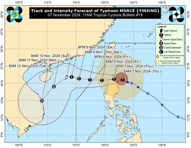 "MARCE will make landfall and traverse Babuyan Islands and/or the northern portions of mainland Cagayan, Ilocos Norte, and Apayao (or pass very close to these areas) from this afternoon until tomorrow (8 November) early morning," PAGASA said.