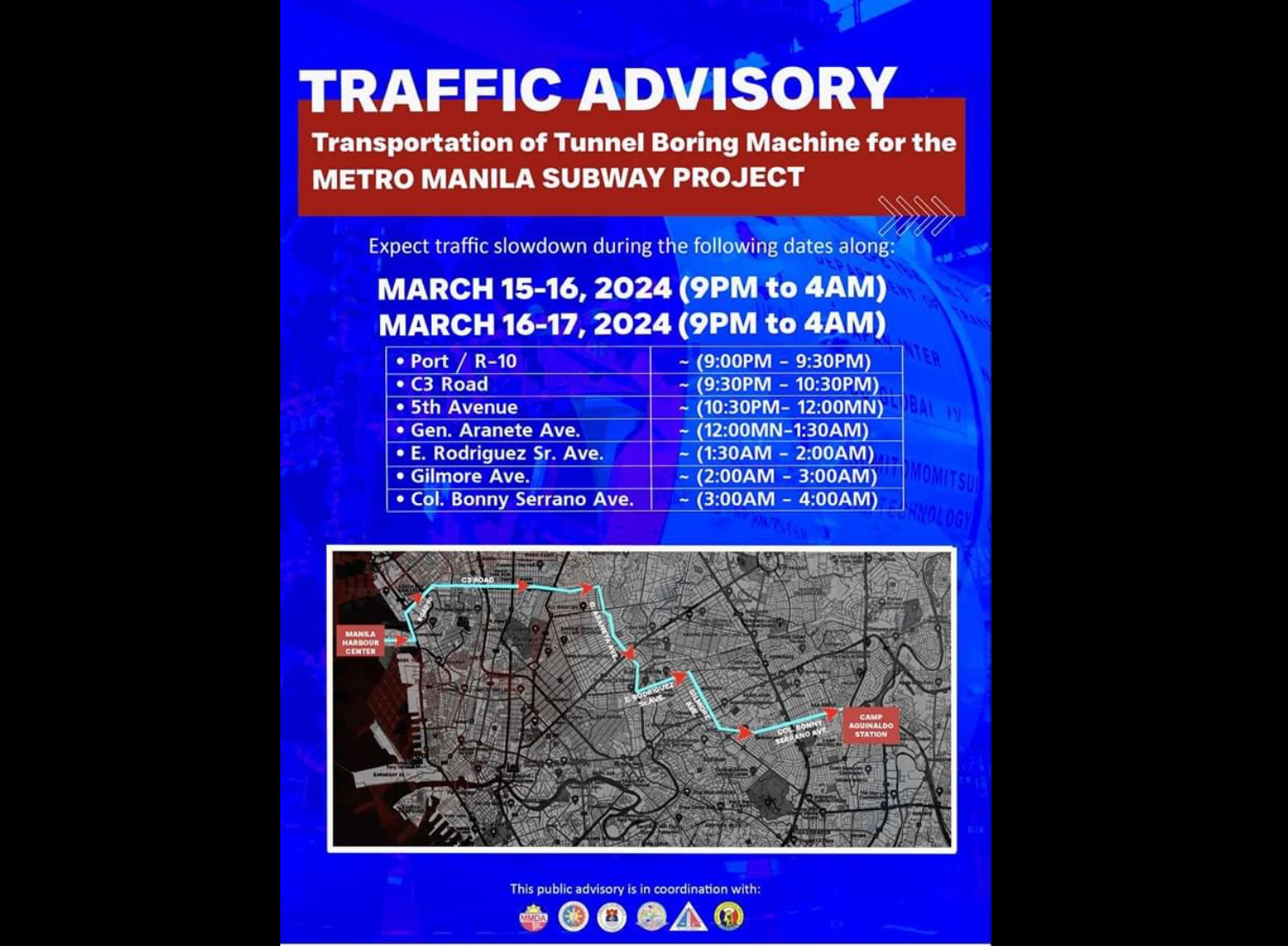 Motorists were advised to expect traffic slowdown on some roads from Friday to Sunday due to the transportation of the Metro Manila Subway Project’s (MMSP) Tunnel Boring Machine (TBM) from Port Area in Manila to Camp Aguinaldo in Quezon City.