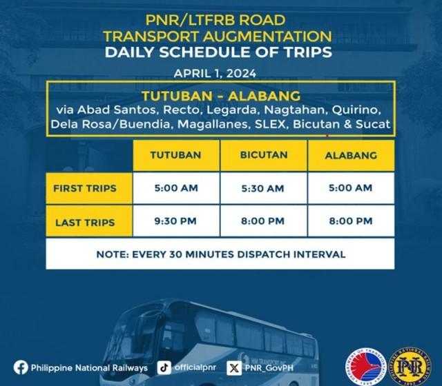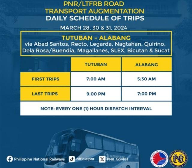 The Philippine National Railways (PNR) announced the schedule of the bus augmentation for the Alabang-Tutuban route with a one-hour interval for March 28, 30, and 31, 2024.