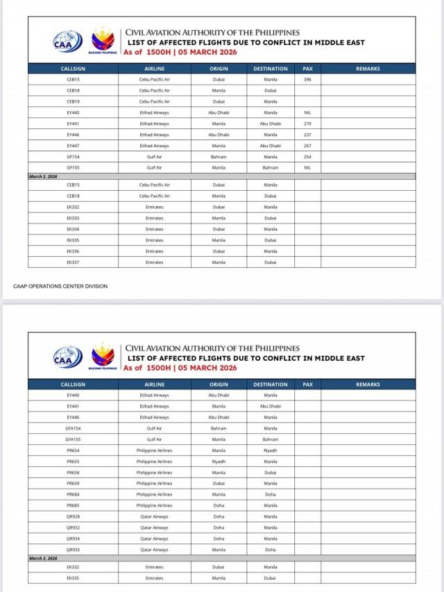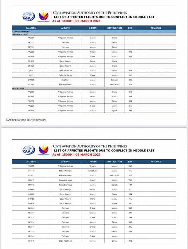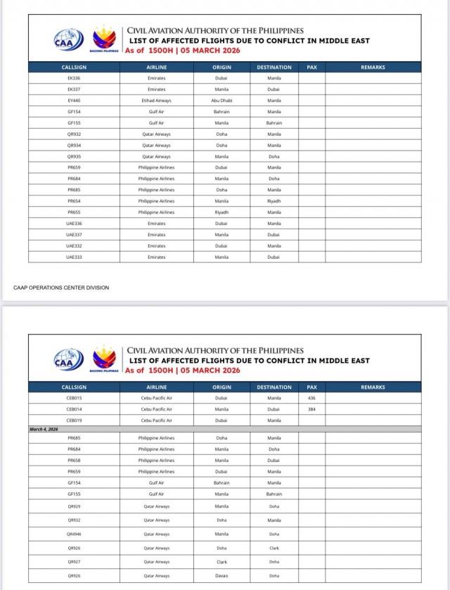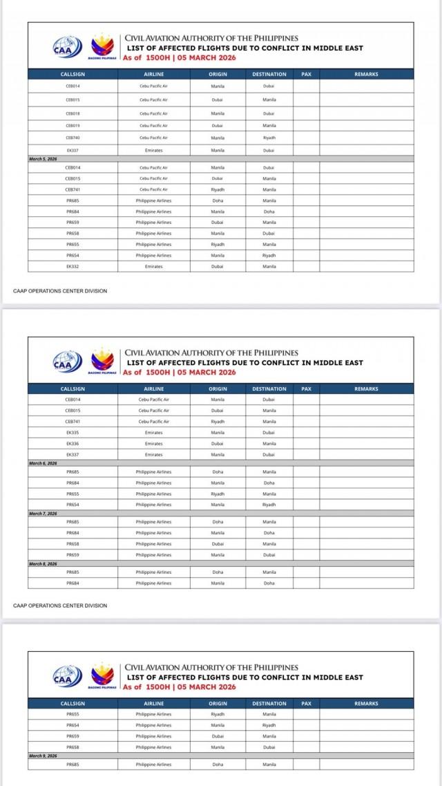 Over 110 flights to and from the Philippines have either been canceled or diverted due to the ongoing armed conflict in the Middle East, the Civil Aviation Authority of the Philippines (CAAP) reported.