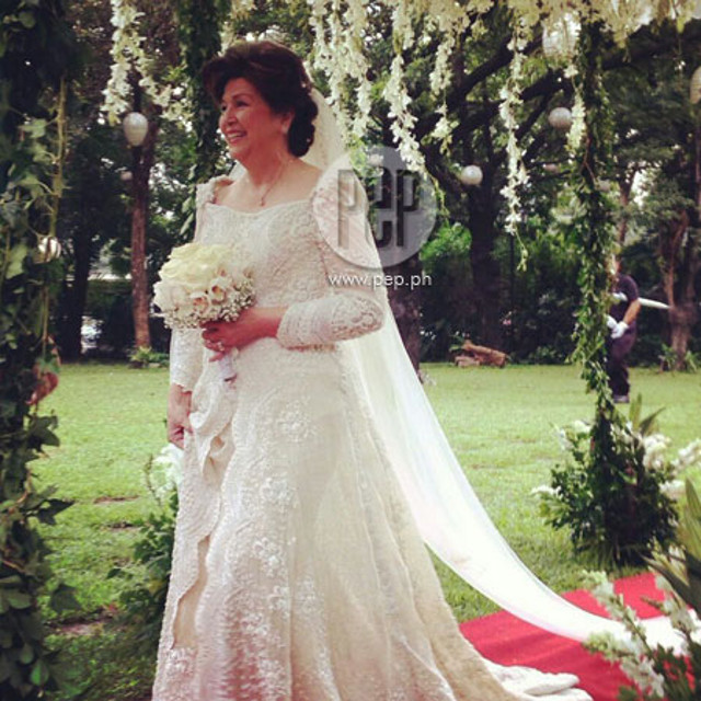 Suot ni Boots and wedding gown na dinisenyo ni Eddie Baddeo nang siya ay ihinatid sa altar ng kanyang dalawang anak.