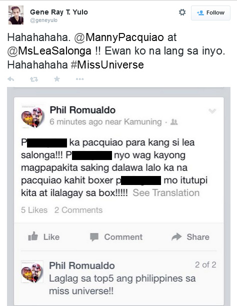 After Mary Jean Lastimosa failed to make the top five of the 63rd edition, where Pacquiao served as judge, of the pageant on Monday, some fans decided to throw some shade at the Filipino ring icon — and even included Lea in the bashing.