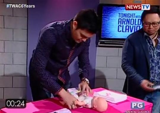 Ipinakita pa si Dingdong kay Arnold kung gaano siya kabilis na maglagay ng diaper sa isang manika na kunwari ay baby.