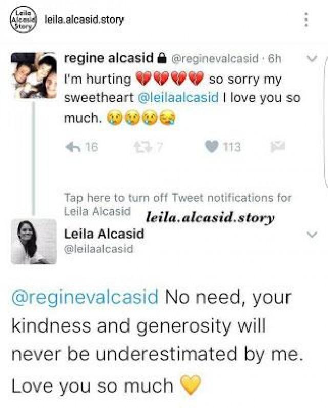 Sa isang Twitter post, humingi ng tawad si Regine kay Leila sa dinaranas nitong pambabatikos.