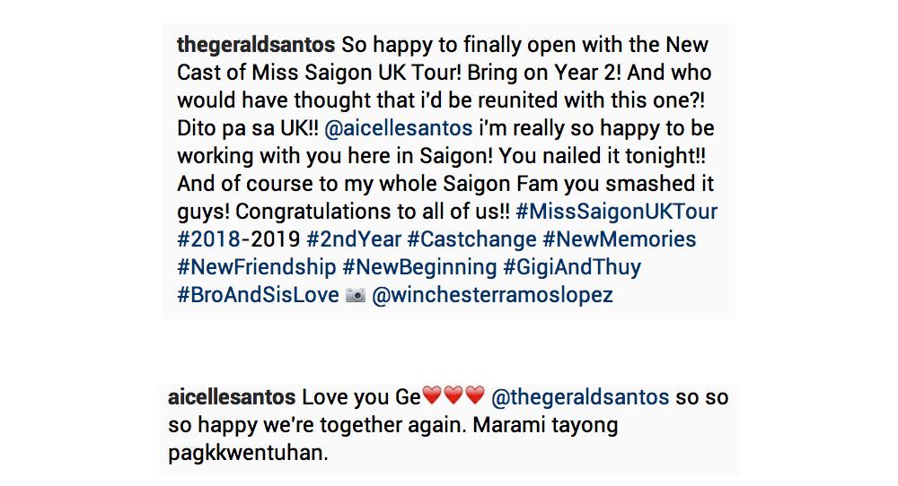 He said, “So happy to finally open with the New Cast of Miss Saigon UK Tour! Bring on Year 2! And who would have thought that i'd be reunited with this one?! Dito pa sa UK!! @aicellesantos i'm really so happy to be working with you here in Saigon! You nailed it tonight!! And of course to my whole Saigon Fam you smashed it guys! Congratulations to all of us!!”
