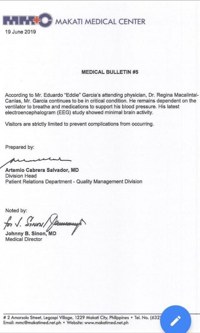 Eddie Garcia's attending physician Dr. Regina Macalintal-Canlas said in a medical bulletin issued on Wednesday that the actor's latest electroencephalogram (EEG) study showed minimal brain activity.