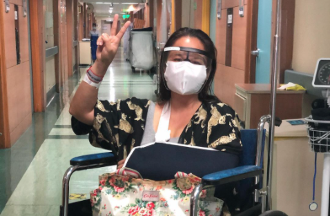 The actress shared a photo of herself on a wheelchair with an arm sling.