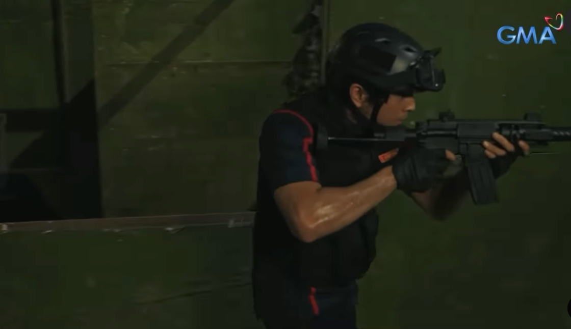 In a “Voltes V: Legacy” scene, Miguel had to quickly land on a cushion, put down his gun, and then switch to an airsoft prop gun to keep up with the fight choreography.