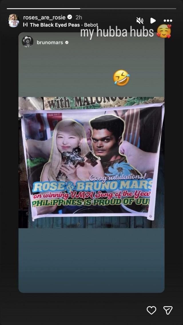 In his Instagram Stories, Bruno posted a photo of a tarpaulin congratulating him and Rose for winning Song of the Year for “APT.” at the MTV Video Music Awards.