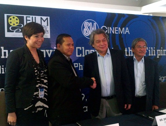 SM Cinema's AVP for cinema and exhibition Christiana Caparas and SVP Edgar Tejerero, FDCP Chairman Briccio Santos, and Ted Granados at Premier Café in the Mall of Asia Arena. Photo by Mac Macapendeg