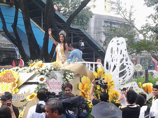Miss Universe 2012 runner-up Janine Tugonon was feted in a motorcade from Quezon City to the University of Santo Tomas in Manila Monday morning.