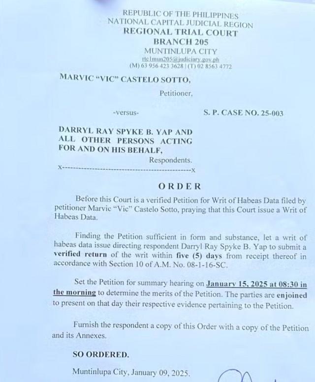 According to Nimfa Ravelo’s report on Super Radyo dzBB, the Muntinlupa Regional Trial Court (RTC) Branch 205 temporarily issued a writ of habeas data filed on Monday by actor and host Vic Sotto, who was mentioned and accused of rape in the teaser.