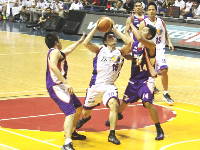 Petron's Joseph Yeo (center) splits the defense of Air21's Pamboy Raymundo (left) and Ren-Ren Ritualo.
