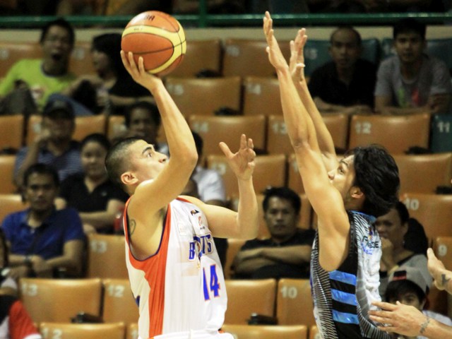 Meralco's Mark Cardona (left) attempts his patented hook shot against a Powerade player. KC Cruz