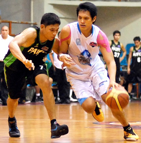 Junior Powerade's Alvin Padilla (right) attacks the defense of RnW Pacific Pipes' Raymond Ilagan. KC Cruz