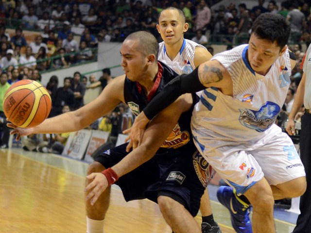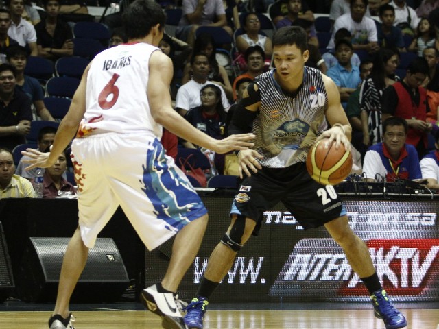 Powerade's Gary David (right) tries to get past the defense of Rain or Shine's Jireh Ibañes. Photo by Jeff Venancio