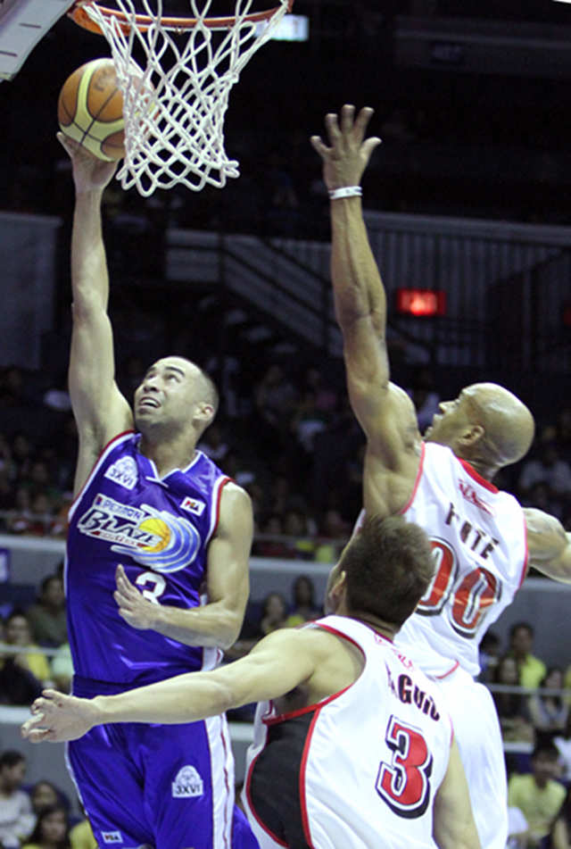Chris Lutz (left) gets by Jason Forte and Cyrus Baguio. Nuki Sabio
