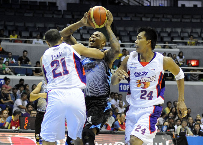 Omar Sneed (center) tries to avoid the Air21 crush of Mark Isip and Magi Sison. KC Cruz